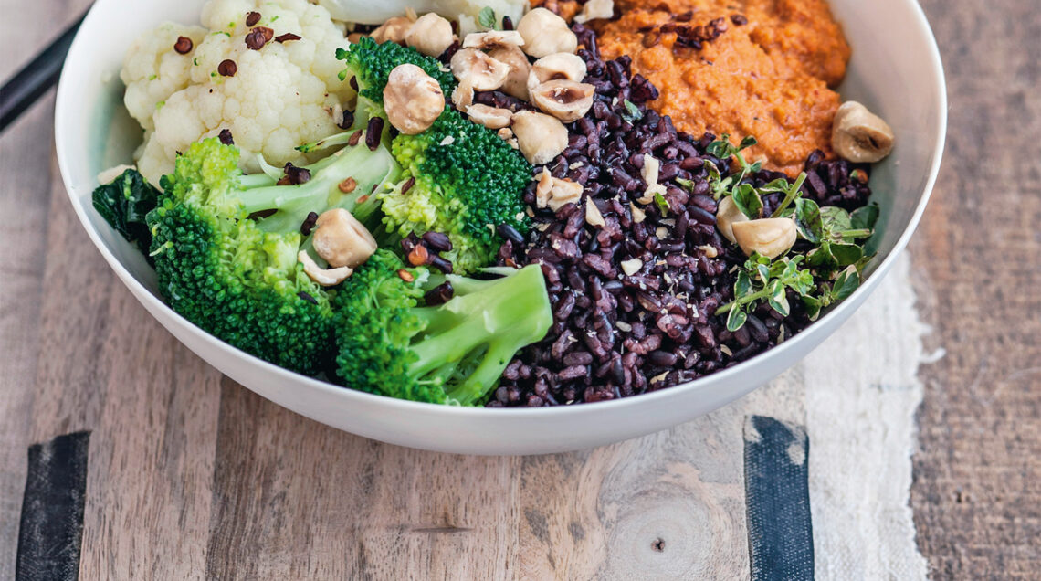 4 Dividete il cavolfiore e il broccolo in cimette, lavatele e lessatele al dente in acqua salata. Servite il riso con le verdure, la salsa, qualche nocciola sminuzzata e le foglioline del timo.