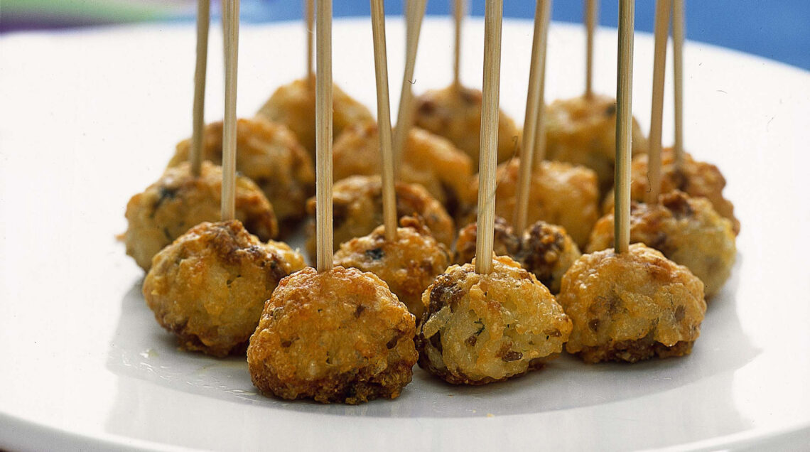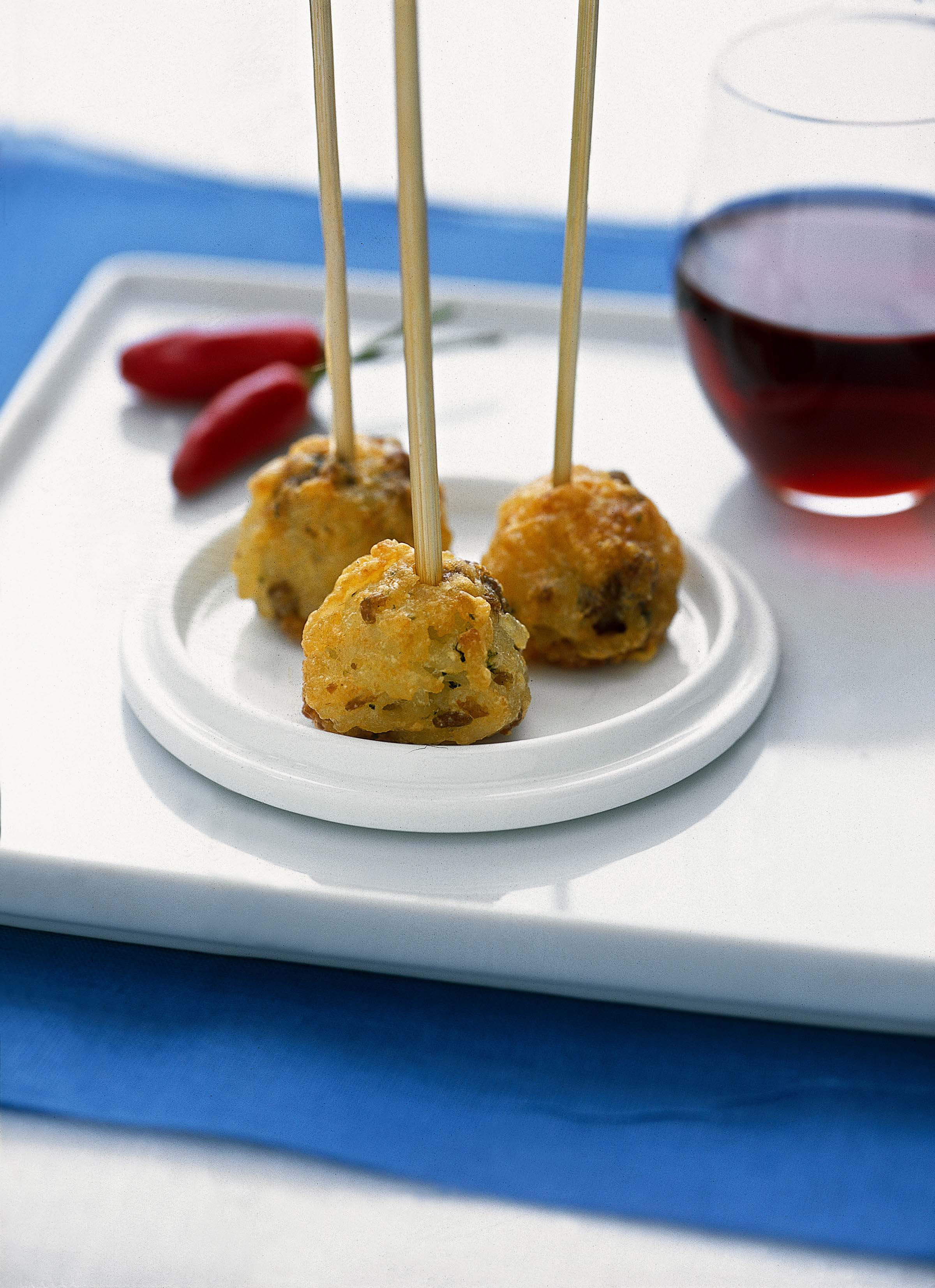 1) Infilza le polpettine di risotto, a una a una, con stecchi di legno: consentono di mangiarle più comodamente. Piccole e graziose, andranno a ruba.
