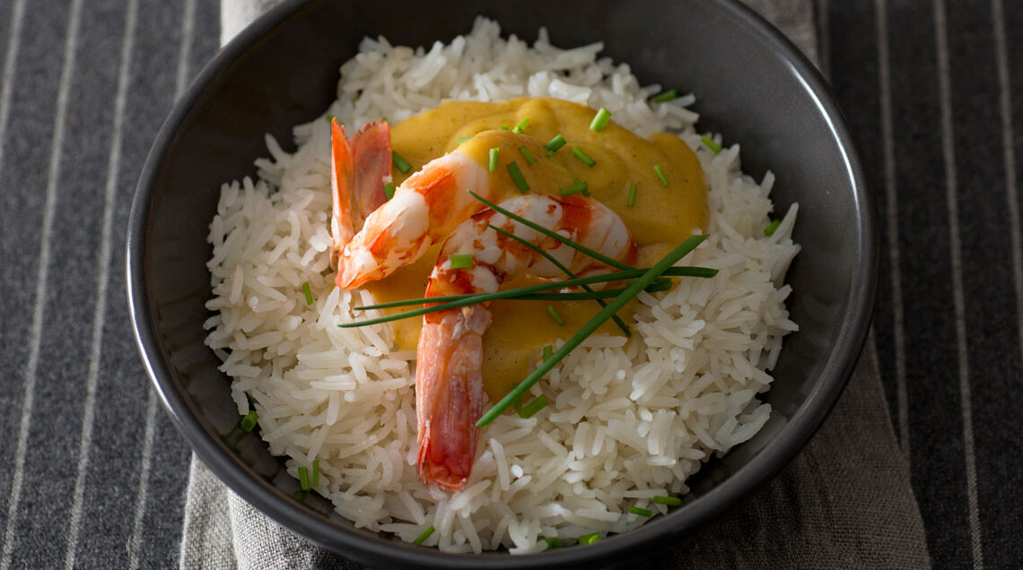 Per questo piatto unico con riso Basmati, gamberi e salsa vellutata abbiamo scelto il curry, miscela di spezie intensa. La base della salsa è una besciamella che, invece del latte, usa un fumetto, ovvero un brodo ristretto preparato con gusci e teste dei crostacei che, in questo caso, usa come grasso il burro, che meglio si lega alla ricetta.