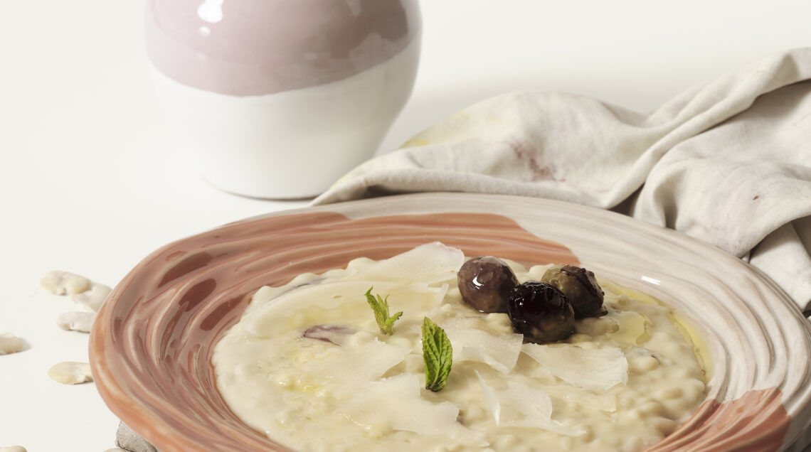 Un riso cremoso con purè di fave e il sapore inconfondibile del Caciocavallo Silano D.O.P. È una ricetta che valorizza i prodotti caseari di Puglia, cucinata in esclusiva per Murgella, dallo chef Luigi Pugliese del ristorante Scinuà. Un primo piatto delicato ma prettamente mediterraneo che nella declinazione vegetariana offre al palato sensazioni uniche di infinita bontà.