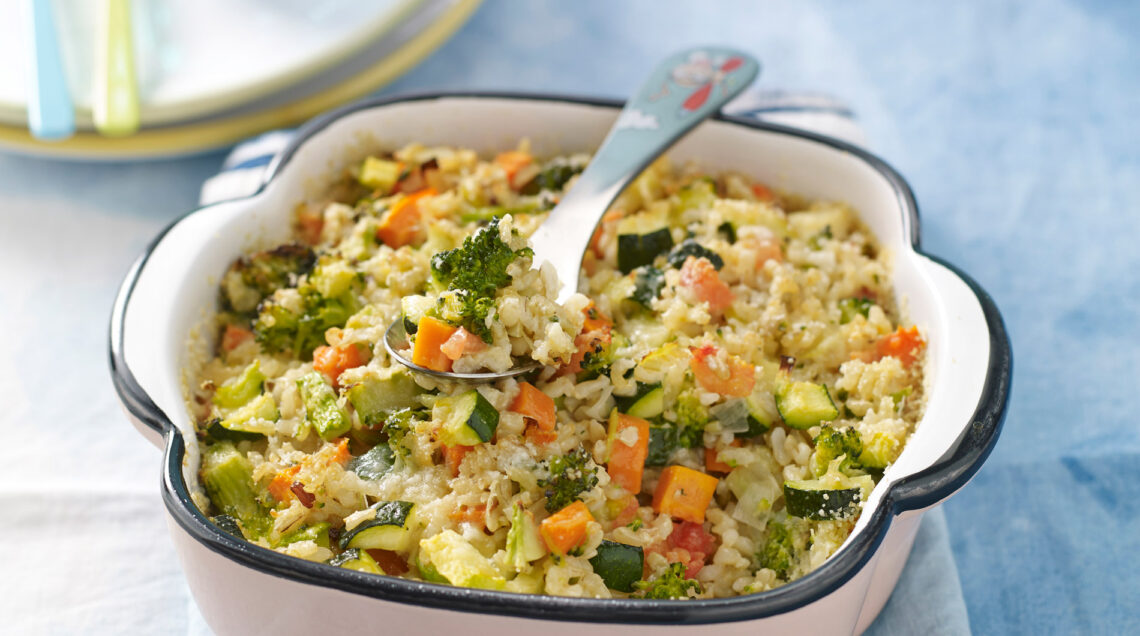 3) Unisci le verdure nella ciotola del riso insieme alle uova sbattute. Mescola bene e regola di sale. Versa in una pirofila unta d'olio e spolverizzata di pangrattato. Cospargi con il formaggio e infornate a 190° per 15 minuti. Sforna e mescola per sgranare riso e uova. Servi la pirofila di riso integrale strapazzato al forno con le verdure.