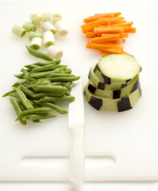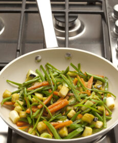 Pulite i cipollotti, tagliatene 2 a tronchetti e tritate il terzo. Sbucciate parzialmente la melanzana, affettatela e riducetela a dadini. Mondate e tagliate a listarelle i peperoncini. Raschiate le carote e affettatele a bastoncini. Pelate le patate, tagliatele a dadini, scottatele per 3-4 minuti in acqua bollente salata e sgocciolale. Scottate per 5 minuti anche i fagiolini spuntati, scolateli e tagliateli a pezzetti.