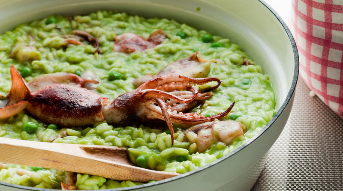 4 Aggiungete i totanetti al risotto negli ultimi 5 minuti di cottura. Quando il riso è pronto mantecatelo con il burro all'acciuga, regolate di pepe e servite.