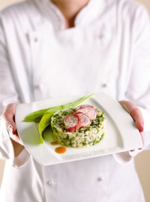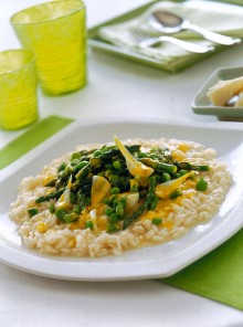 3) Fate tostare il riso in un tegame senza condimento. Quando sarà caldo, portatelo a cottura mescolando spesso e versando un mestolino di brodo quando occorre. Spegnete e mantecate con il pecorino grattugiato e il mascarpone. Dividete il risotto nei piatti e guarnitelo con la salsa, la brunoise scolata dalla marinatura, abbondante pepe macinato e foglie di mentuccia.