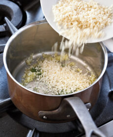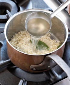 In una casseruola metti a soffriggere il resto della cipolla insieme a 2 cucchiai di olio e l'alloro rimasto, poi aggiungi il riso e lascialo tostare, continuando a mescolare. Sfuma il riso con ½ bicchiere di vino, aggiungi ½ litro di brodo filtrato e sposta il tutto in una pirofila, poi cuoci in forno a 180° per circa 18 minuti.