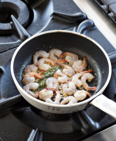 Aggiungi i gusci dei gamberi, bagna con 1/2 bicchiere di vino bianco e lascia evaporare. Ora aggiungi il pomodoro a pezzi, 1 foglia di alloro, 1 rametto di timo poi aggiungi 1 litro e ½ di acqua. Sala e pepa, lascia bollire fino a quando il brodo non è diventato la metà.