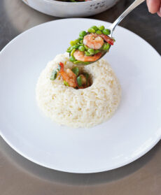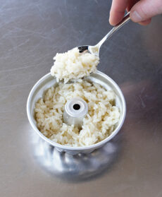 Prendi 4 piccoli stampi con foro centrale e riempili di riso. Sforma gli anelli di riso sui piatti e riempi il foro centrale con il ragù preparato. Condisci con un filo d’olio e gustali insieme ai tuoi ospiti.