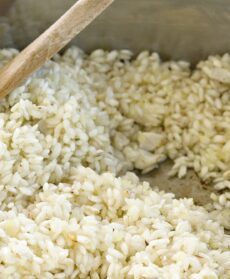 Unite il riso e lasciatelo tostare per un minuto, quindi sfumatelo con il Calvados. Proseguite la cottura del risotto per 18 minuti, bagnandolo di tanto in tanto con un mestolo di brodo bollente. Mescolate di frequente e aggiustate di sale.