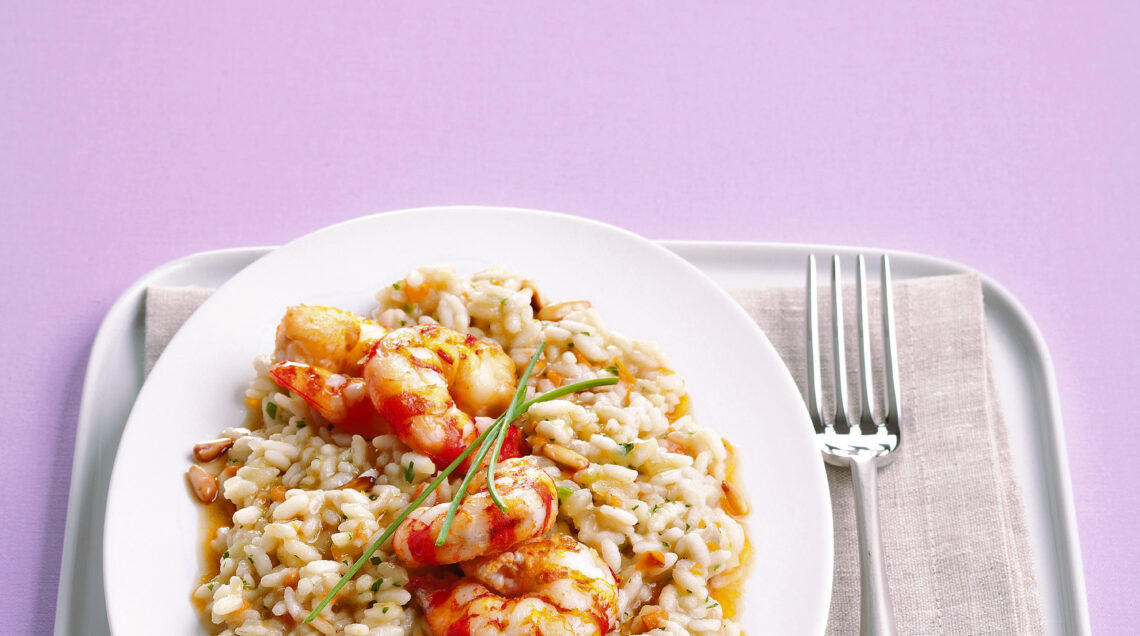 2) Profuma il risotto con un po’ di erba cipollina spezzettata e distribuiscilo nei piatti. Servi il risotto con le mazzancolle e i pinoli al burro e il loro fondo di cottura. Decora a piacere con dei fili di erba cipollina.