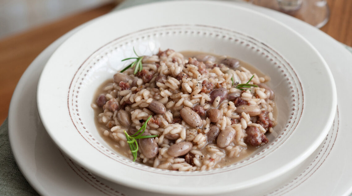 Vino rosso per sfumare, fagioli, salsiccia e cotica: un primo al cucchiaio robusto e dal sapore pieno, che profuma di rosmarino