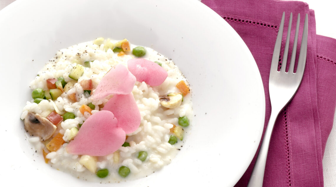 3) Aggiusta di sale e pepe e manteca con 20 grammi di burro e 2-3 cucchiai di parmigiano. Lascia insaporire per un minuto e aggiungi infine i petali di rosa, quindi gusta subito il riso aromatico ai petali di rosa.
