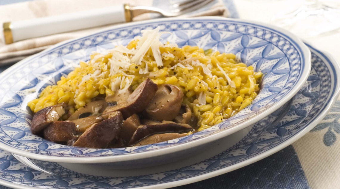 2) Distribuisci il risotto in 4 piatti individuali, guarnisci ogni porzione con i porcini trifolati e servi in tavola.
