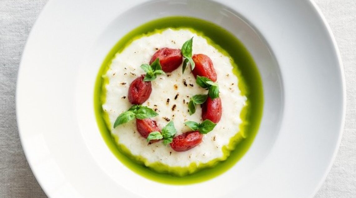C'è tutta l'eleganza mediterranea in questo risotto firmato dallo chef campano Francesco Sposito, arricchito con un "latte" di bufala e profumato di pomodorini e basilico.