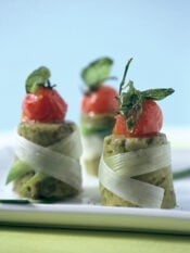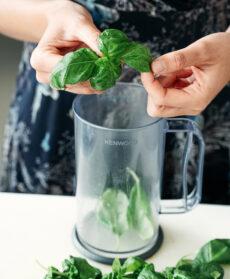 Preparate un litro di brodo vegetale con il sedano, la carota e una cipolla. Nel frattempo lavate il basilico, asciugatelo e frullatelo con olio, 2 cubetti di ghiaccio e un pizzico di sale fino a ottenere un pesto cremoso. Tritate finemente a coltello la scorza di limone.