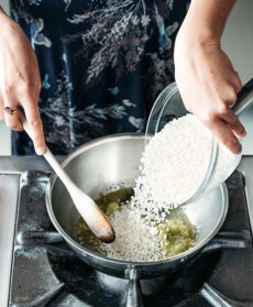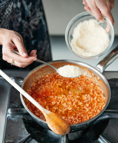 A cottura ultimata, mantecate il risotto a fuoco spento con il parmigiano e un po' di olio.