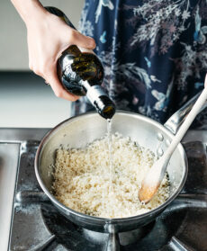 Quindi sfumate con un goccio di vino bianco e fatelo evaporare completamente. Poi versate 4 mestoli di brodo vegetale e cuocete il riso girandolo continuamente, formando un "8" con il cucchiaio.