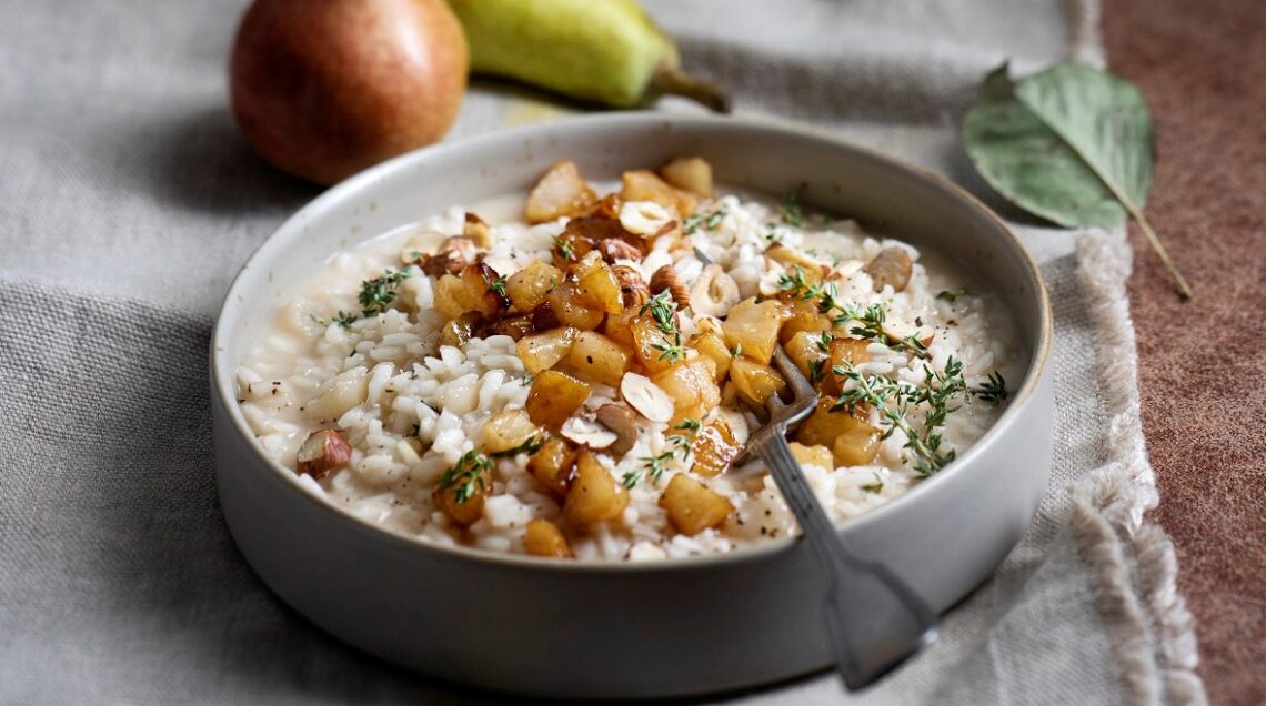 1 Sbucciate lo scalogno e tritatelo finemente. Sbucciate le pere, eliminate il torsolo e tagliatele a cubetti di 1 cm. Scaldate il brodo. Tagliate il taleggio a pezzetti. Tagliate le nocciole a fettine e tostatele senza grassi in una padellina antiaderente per 2 minuti.