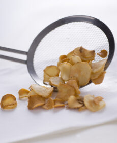 Distribuite il risotto nei piatti individuali, guarnite con le chips di topinambur preparate e servite subito.