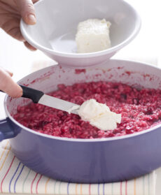 Bagnate ancora il risotto con poco brodo caldo, mescolate e terminate la cottura. Quando il risotto sarà pronto, spegnete il fuoco, regolate di sale e unite una macinata di pepe. Fatelo mantecare con la crescenza a tocchetti, 3-4 cucchiai di grana grattugiato e la barbabietola a dadini rimasta, mescolando bene per amalgamare gli ingredienti. Lasciate riposare per 2-3 minuti.