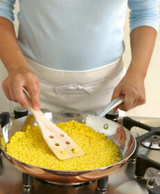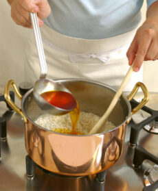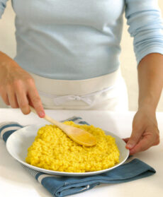 Alla fine, incorporate al risotto i pistilli di zafferano, mantecatelo con una noce di burro e il grana grattugiato. Regolatelo di sale, trasferitelo su un piatto e appiattitelo con un cucchiaio di legno per farlo raffreddare più in fretta, fermarne la cottura e sgranarlo bene.