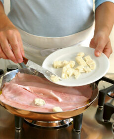 Distribuite le fette di prosciutto e 100 g di gorgonzola tagliato a dadini sul riso, coprite tutto con il risotto rimanente, appiattite bene anche questo e proseguite la cottura ancora per qualche istante, sempre scuotendo la padella.