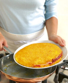 Girate il tortino di riso come se fosse una frittata, aiutandovi con un piatto piano o un coperchio in misura. Mettete in padella il resto del burro, fatevi scivolare dentro il tortino con delicatezza e lasciatelo saltare allo stesso modo anche dall'altro lato.