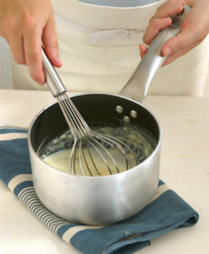 Preparate il soffritto iniziale con 30 g di burro e la cipolla tritata fine; unite il riso, tostatelo, sfumatelo con il vino e poi portatelo a una cottura molto al dente con il brodo bollente. A metà cottura, aggiungete lo zafferano in polvere sciolto in un mestolo di brodo.