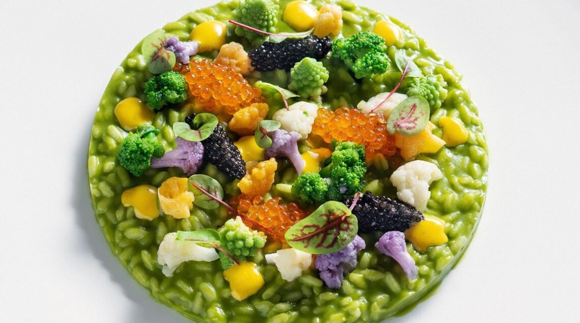 7) In una padella con un filo d'olio e il burro rimasto fate saltare brevemente tutte le cimette sbollentate. Con l'aiuto di un disco coppapasta, suddividete il riso nei piatti, guarnitelo con le cimette saltate, alcune goccioline di salsa all'uovo, minuscole quenelle di uova di trota e caviale e foglioline di crescione Vene Cress.
