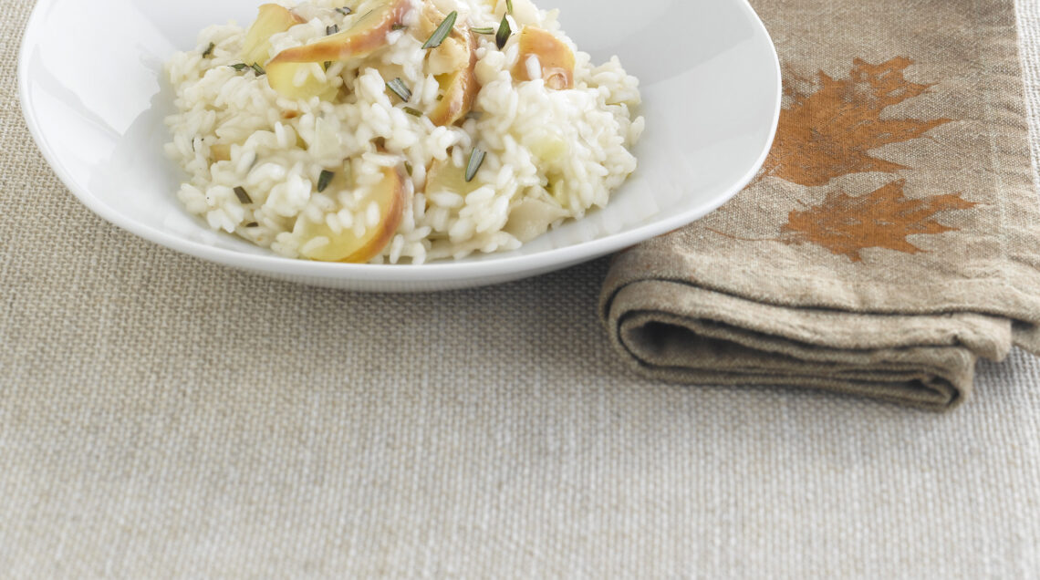 2) Irrora con un mestolo di brodo caldo e unisci le mele private del torsolo e ridotte in parte a tocchetti, in parte a fette. Regola di sale e pepa.
