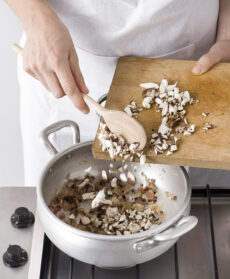 3) Trita la cipolla rimasta con la pancetta e un po' di prezzemolo e timo. Soffriggi il mix con metà del burro, unisci i funghi a dadini e falli insaporire qualche istante (tienine qualche fetta intera per decorare). Aggiungi il riso e rosolalo un poco, sfumalo con il vino, bagnalo con un mestolino del fumetto preparato e portalo aggiungendo un po' di brodo ogni volta che si asciuga.