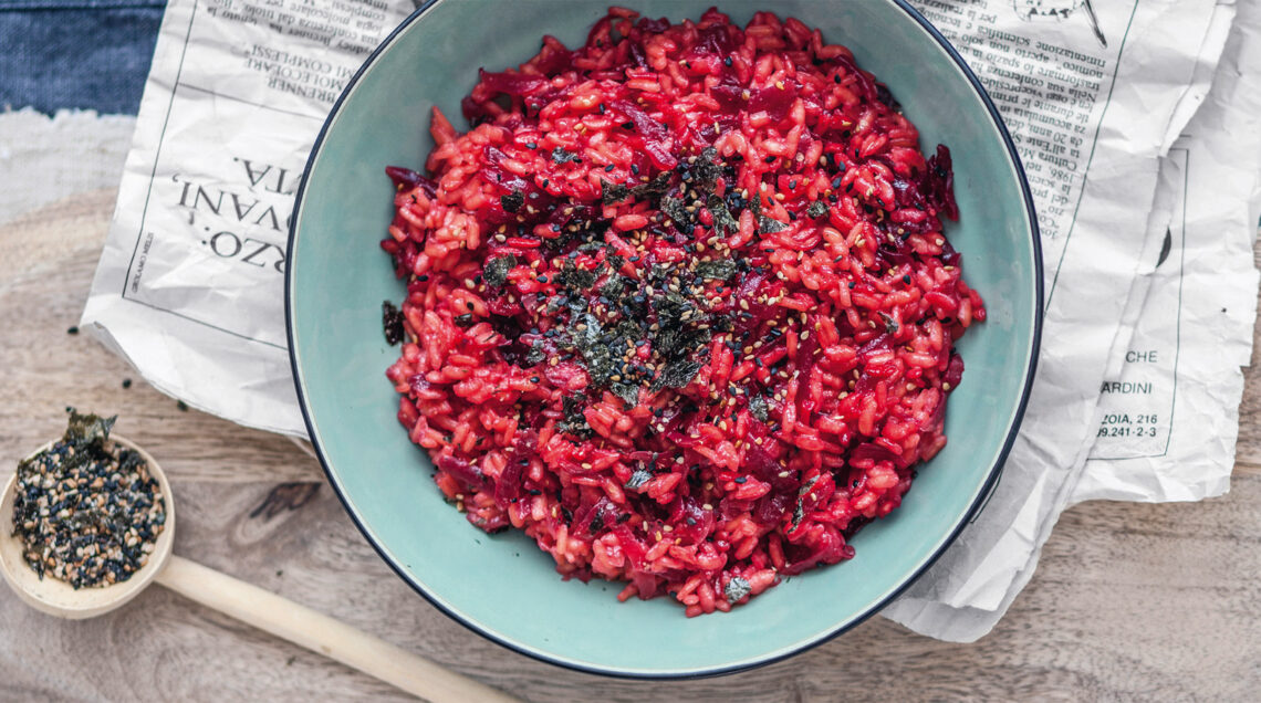 3 Grattugiate la barbabietola, unitela al riso, mescolate, coprite e fate riposare fuori dal fuoco per 3 minuti. Regolate di sale e servite cospargendo di furikake. Potete conservare quello che non usate in un barattolo (dura qualche settimana).
