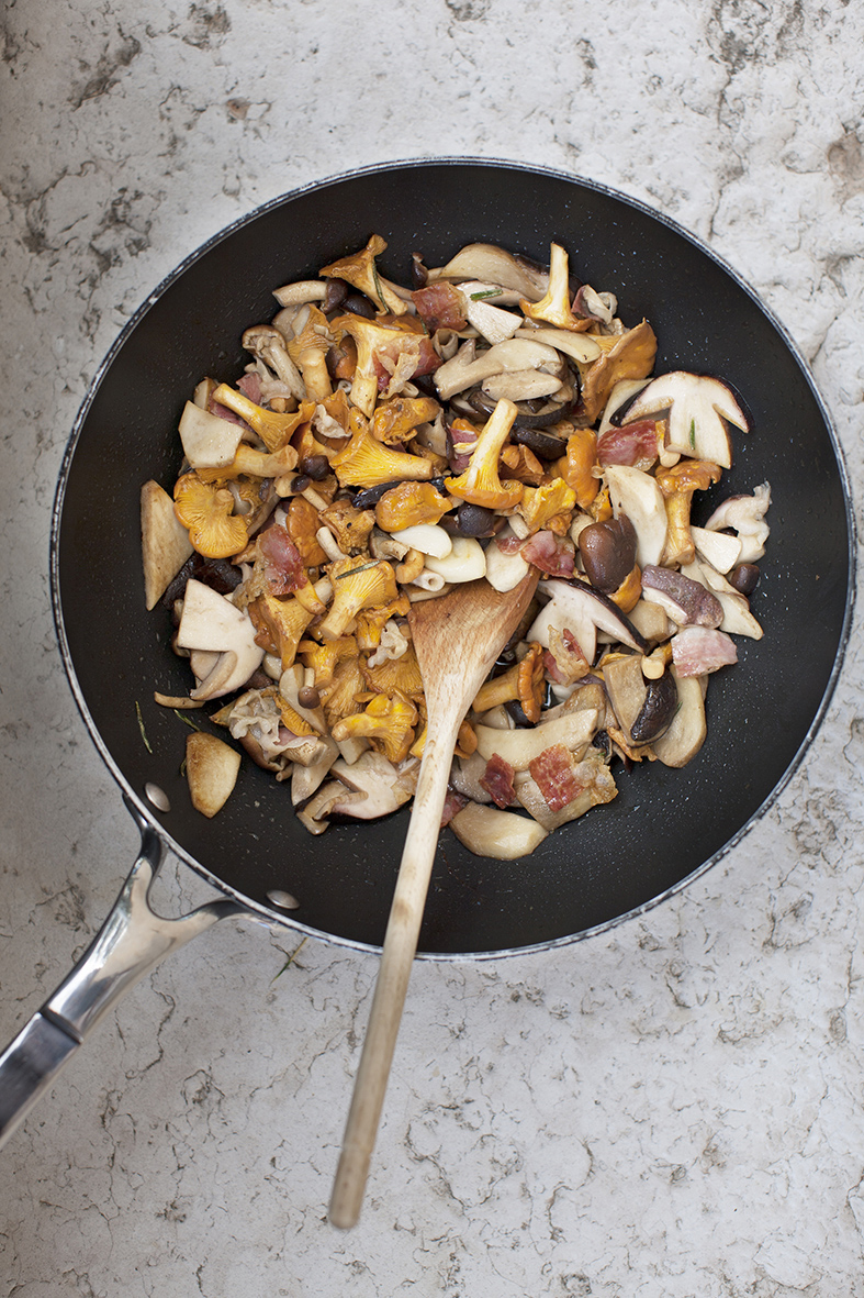 1) Pulisci i funghi con i quali condirai il tuo risotto in bianco esternamente, ed affetta quelli più grandi. Trita grossolanamente la pancetta. Scotta per 5 minuti circa gli spicchi di aglio tagliati a metà in acqua bollente e già salata; scolali, tritali e soffriggili con la pancetta e poco olio all'interno di un tegame.