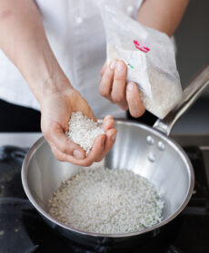 Unisci al riso un mestolo di brodo bollente e continua la cottura aggiungendo man mano altro brodo: alla fine dovrai ottenere un risotto “all'onda”.