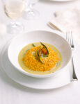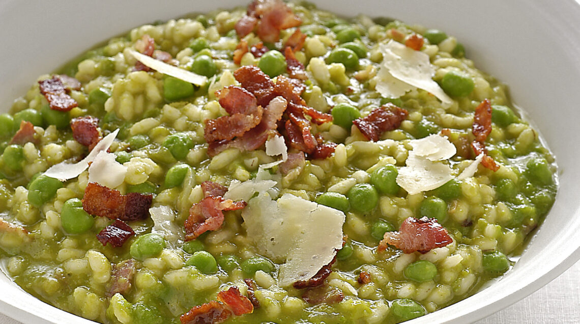 3) Unisci la cipolla e rosolala finché è trasparente; aggiungi i piselli rimasti e il riso e porta a cottura unendo poco alla volta brodo vegetale e piselli, ben caldi. Quando è pronto, manteca il risotto con la metà del grana grattugiato e suddividilo nei piatti, cospargendolo con scaglie di grana.