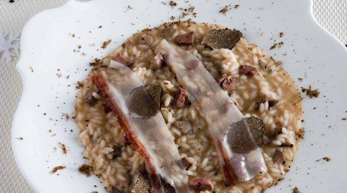 4) Manteca il risotto con il parmigiano e il burro al tartufo preparato e regola di sale. Versalo nei piatti individuali, cospargi con il resto dei fegatini, guarnisci con le fettine di tartufo velate dalle fette di lardo tagliate a metà . Pepa a piacere.