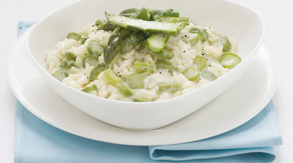 4) Spegni il fuoco e aggiungi lo stracchino a pezzetti, 1-2 cucchiai di grana padano grattugiato, il burro rimasto e le punte degli asparagi. Mescola con delicatezza il risotto cremoso agli asparagi, lascia riposare 1-2 minuti e servi.