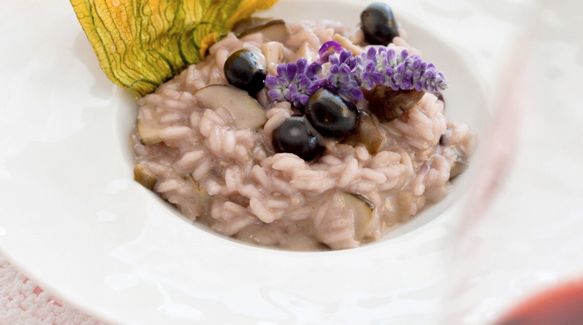 1) Rosola 1 cipolla tritata con 20 g di burro; unisci 200 g di porcini puliti e affettati e 50 g di mirtilli. Dopo 2 minuti incorpora 320 g di riso, fallo tostare, bagna con 1 mestolo di brodo bollente e porta a cottura unendo altro brodo caldo (circa 1 litro) e mescolando a ogni aggiunta.
