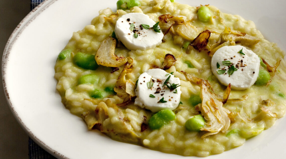 3) Fuori dal fuoco manteca con metà del caprino e aggiungi le verdure intere. Distribuisci nei piatti e completa con il caprino rimasto a rondelle, foglie di timo e pepe.