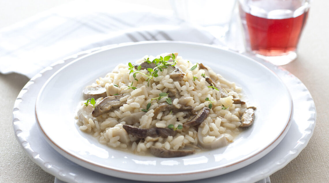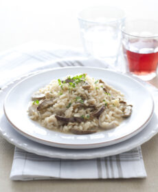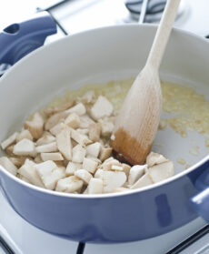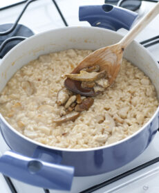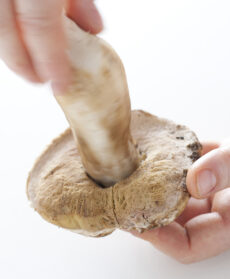 1) Per la preparazione del risotto ai funghi mantecati inizia dai funghi: elimina la parte terrosa dei gambi dei funghi con un coltellino, poi raschiali con la lama e pulisci i cappelli con un telo inumidito, per eliminare tutti i residui di terra. Stacca i cappelli dai gambi, ruotandoli con delicatezza, e taglia i primi a fettine e i secondi a dadini. Spella la cipolla o lo scalogno, sciacquali e tritali finemente, poi soffriggili nella casseruola con 30 g di burro a fiamma dolce, finche sara leggermente appassita.
