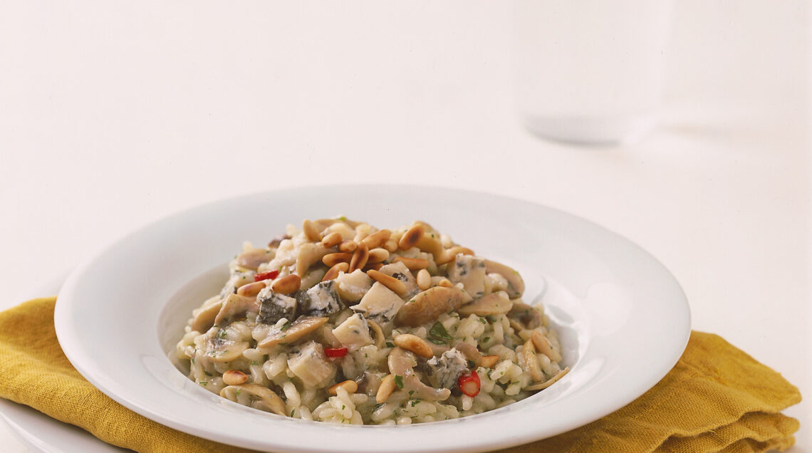 3) Unisci i funghi, il restante gorgonzola tagliato a cubetti, i pinoli tostati e servi ben caldo.