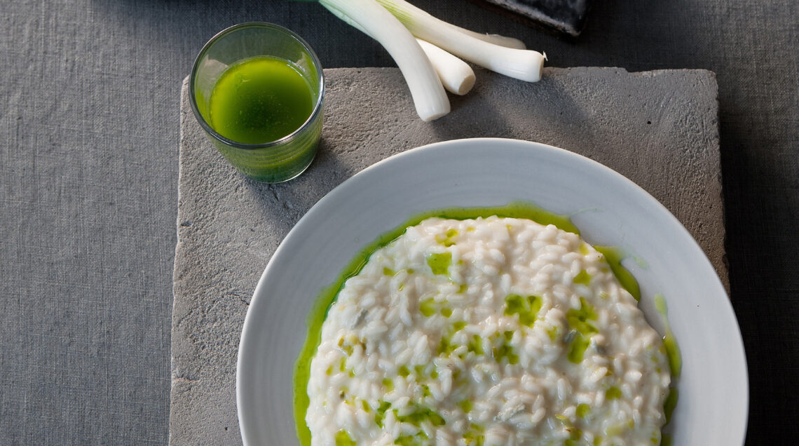 4) Se ti piace, puoi aggiunge alcune gocce della crema di rucola ottenuta filtrando l'olio: colorerà il riso di un bellissimo verde.