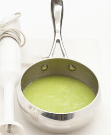 2) Mettete le rondelle d'asparago nella casseruola con il soffritto di cipollotti e cuocetele per 5 minuti, a fuoco basso. Prendete metà del mix dalla casseruola, trasferitelo in un pentolino, copritelo di brodo caldo e cuocete finché le rondelle saranno diventate morbidissime; togliete il composto dal fuoco, frullatelo con un frullatore a immersione, salate, pepate e tenete la crema ottenuta in caldo.