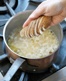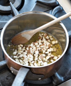 Porta il brodo ad ebollizione; metti in una casseruola la cipolla tritata e 4 cucchiai di olio, aggiungi il midollo sminuzzato e lascia soffriggere finché la cipolla non risulterà appassita ed il midollo non sarà sciolto. Aggiungi i dadini di funghi, mescola bene con l'aiuto di un cucchiaio e lascia cuocere per un paio di minuti.