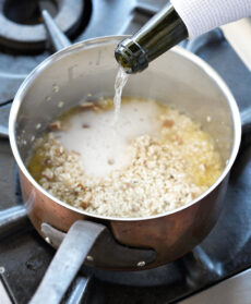 Unisci il riso alla dadolata di funghi e fallo tostare mescolando delicatamente; dopo 2/3 minuti, bagnalo con il vino e lascia evaporare la parte alcolica. Versa poi un mestolo di brodo e, appena il riso l'avrà assorbito, aggiungine un altro. Continua la cottura versando di tanto in tanto altro brodo: a cottura ultimata il risotto con topinambur e porcini dovrà risultare all'onda.