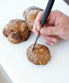 Nel frattempo, incidi leggermente con la punta di un coltellino le cappelle dei funghi per la ricetta del risotto tenute da parte, mettile in una teglia, spennellale con 3 cucchiai di olio e passale in forno a 200° per 3-4 minuti.