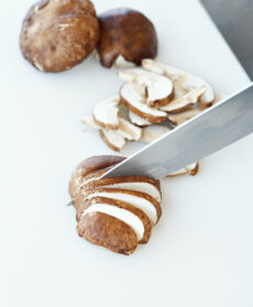 Pulisci i funghi, elimina la parte terminale (la più terrosa) e dividi i gambi dalle cappelle; passa le cappelle in un telo umido per idratarle, tienine da parte 4 e taglia le altre a fettine; taglia i gambi a dadini.