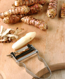 Sbuccia i Topinambur che ti serviranno per il risotto ai funghi con l'aiuto di un coltellino affilato o di un pelapatate; tagliali a fettine molto sottili.