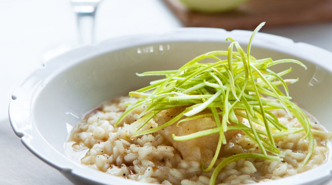 3) Completa e servi. Profuma il risotto con una macinata di pepe nero e mescola delicatamente. Versa il risotto sui piatti e servi ciascuna porzione con una quenelle di composta di mele preparata. Decora con la julienne di buccia di mela verde e servi subito.