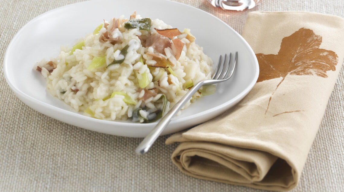 1) Taglia lo speck a pezzetti. Pulisci i porri eliminando le radichette e buona parte delle foglie verdi e riducili a tocchetti. Trita finemente l'aglio. Sciogli 20 g di burro in un tegame e rosolaci gli ingredienti preparati con le foglie di salvia spezzettate.