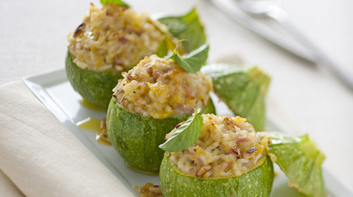 4) Mescola bene il risotto e distribuiscilo all'interno delle zucchine asciugate con carta da cucina, cospargile con il grana rimasto e sistemale in una pirofila imburrata, con accanto le loro calottine. Condisci il tutto con il restante burro fuso e poni in forno già caldo a 200° per circa 10 minuti.